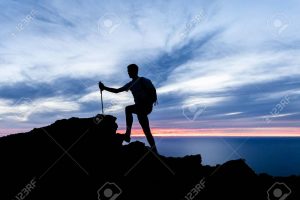 Man hiking silhouette in mountains, sunset and ocean inspirational landscape. Male hiker with walking sticks on top of mountain looking at beautiful night sea landscape.